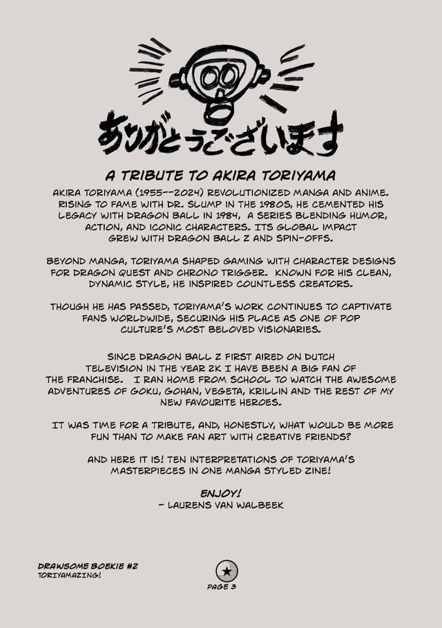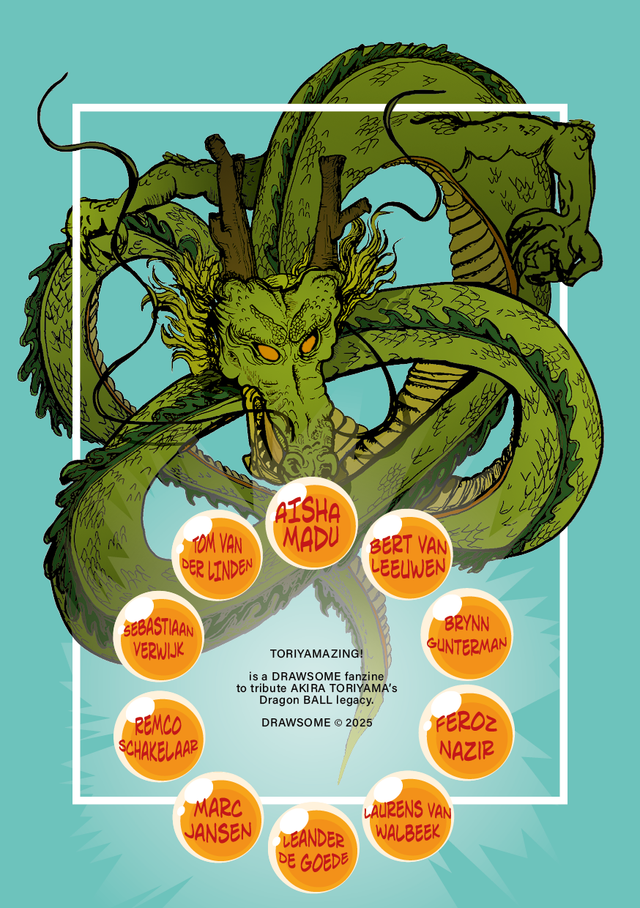 Samen met tekenaars Aisha Madu, Bert van Leeuwen, Brynn Gunterman, Feroz Nazir, Laurens van Walbeek, Leander de Goede, Marc Jansen, Remco Schakelaar, Sebastiaan Verwijk, Tom van der Linden laten we ons licht schijnen over een zine vol fan-art over het geweldige nalatenschap van Akira Toriyama, de Dragon Ball franchise.